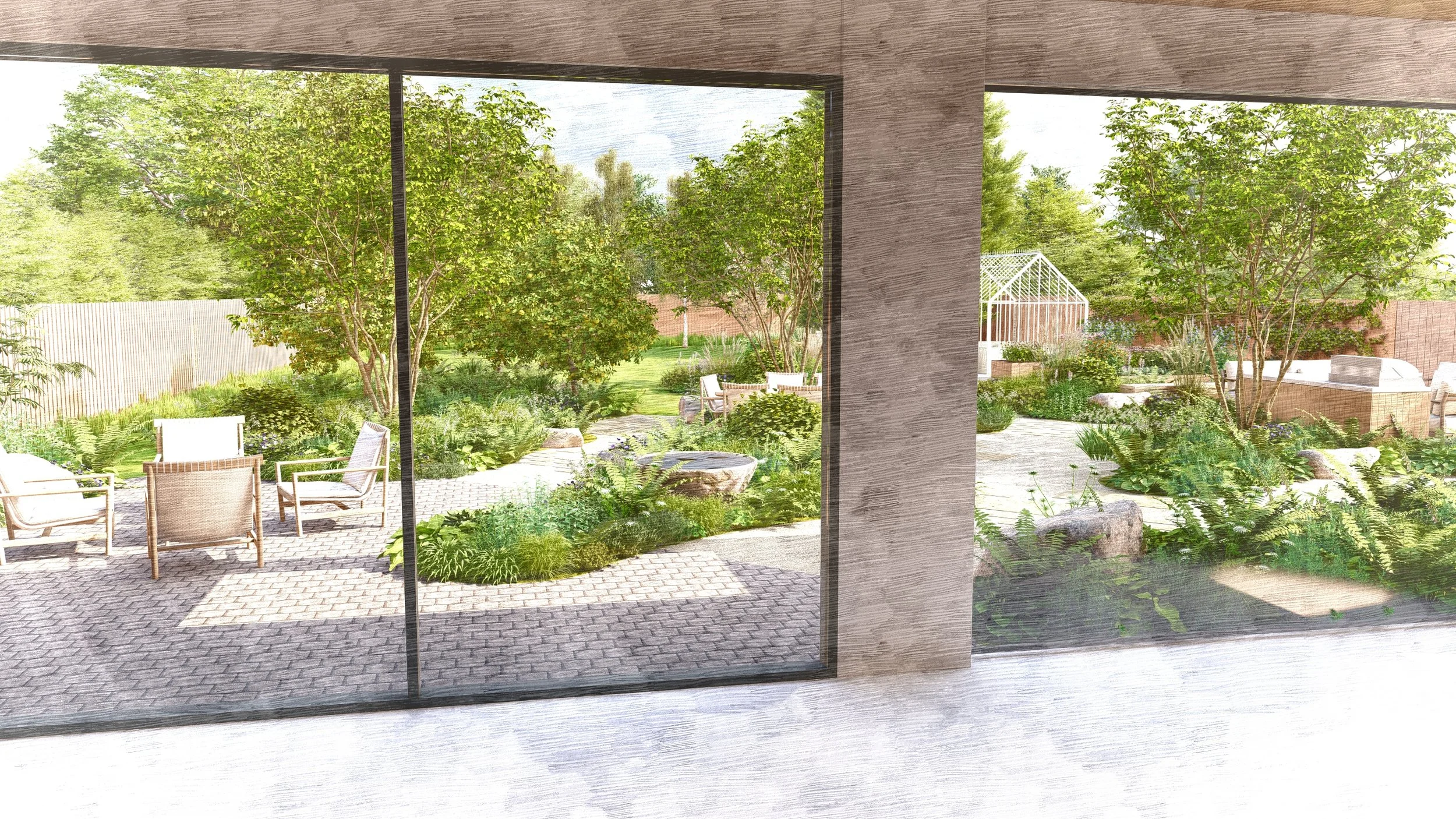 Layered planting, from lush understorey species through to structured topiary and multi-stemmed feature trees, brings depth, rhythm, and seasonal movement to the scheme. This varied structure provides shade and enclosure, while also supporting biodiversity, creating a rich and evolving habitat for wildlife throughout the year.