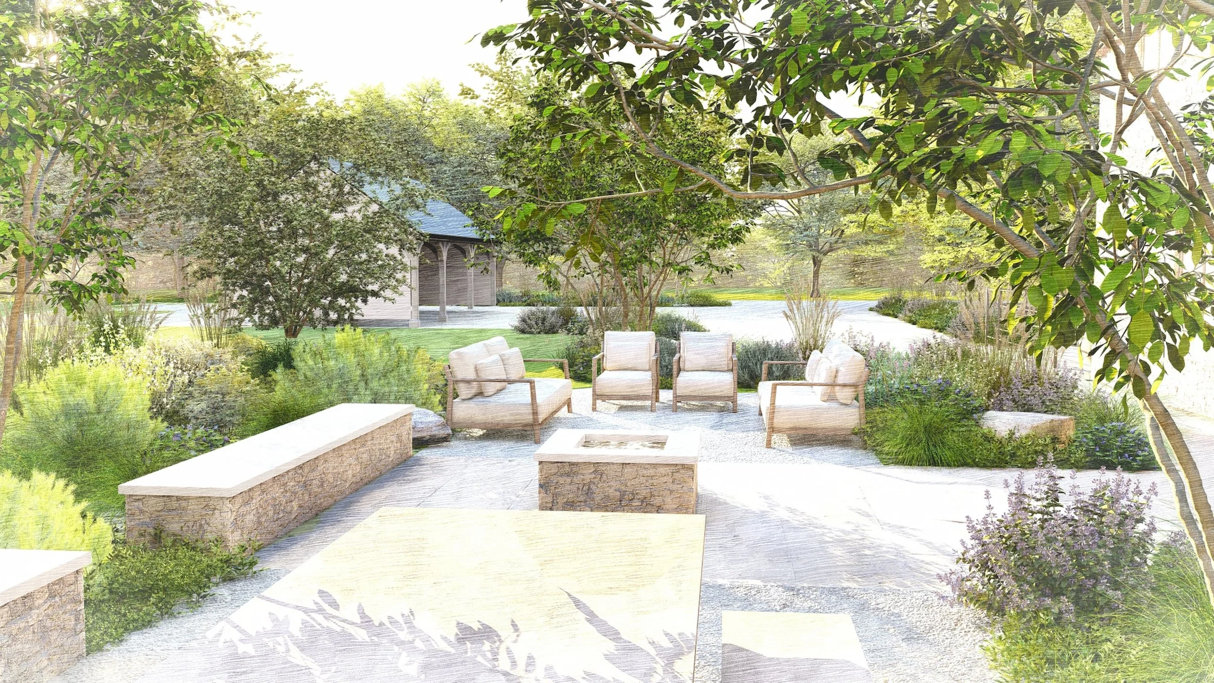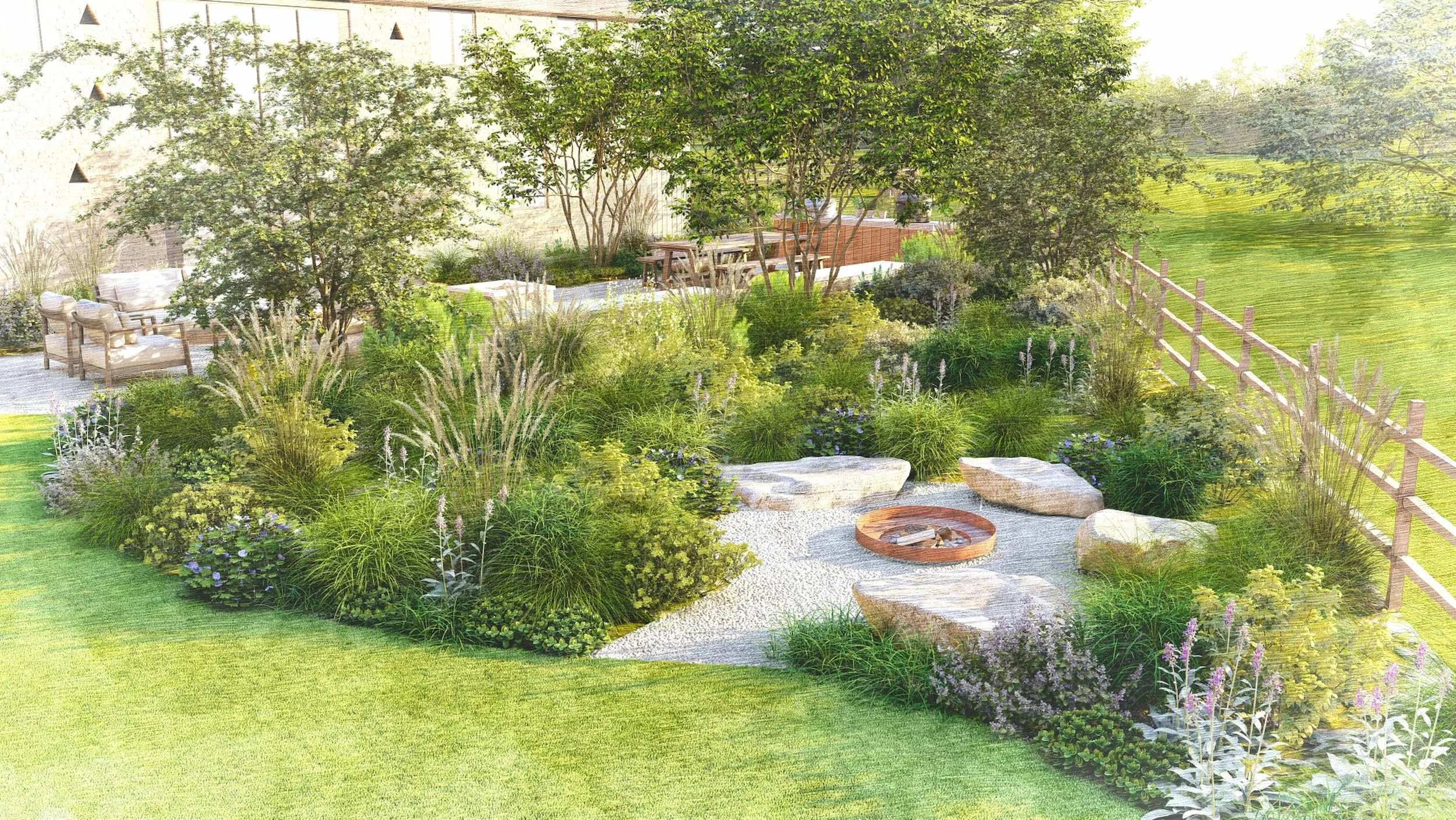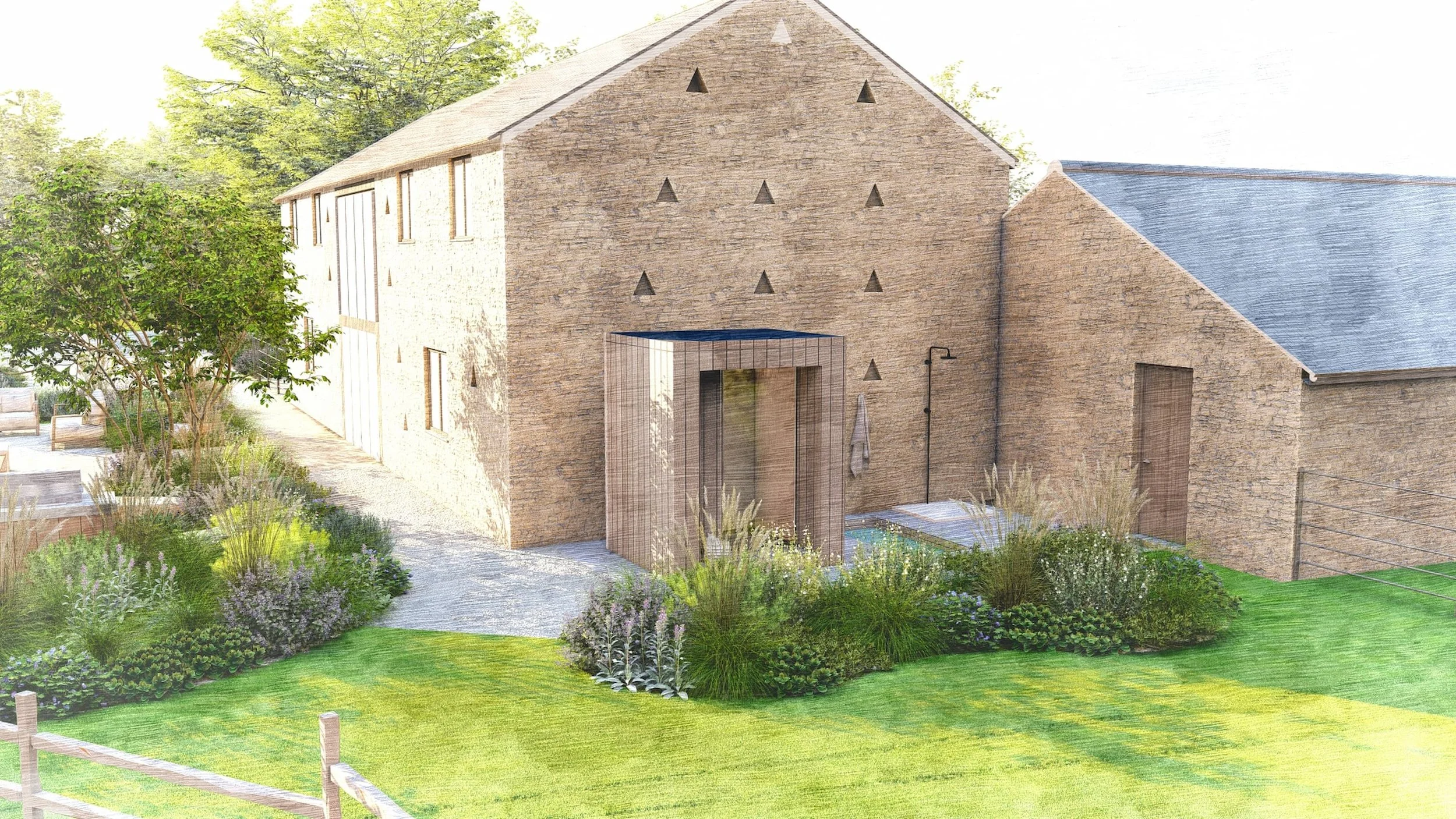 Inspired by the Shropshire Hills and the wider landscape context, this garden surrounding an old stone agricultural barn is designed to balance rural character with functional family living. The scheme brings together a series of distinct garden elements to create a space that supports both play and wellbeing, ensuring it works for children and parents alike.